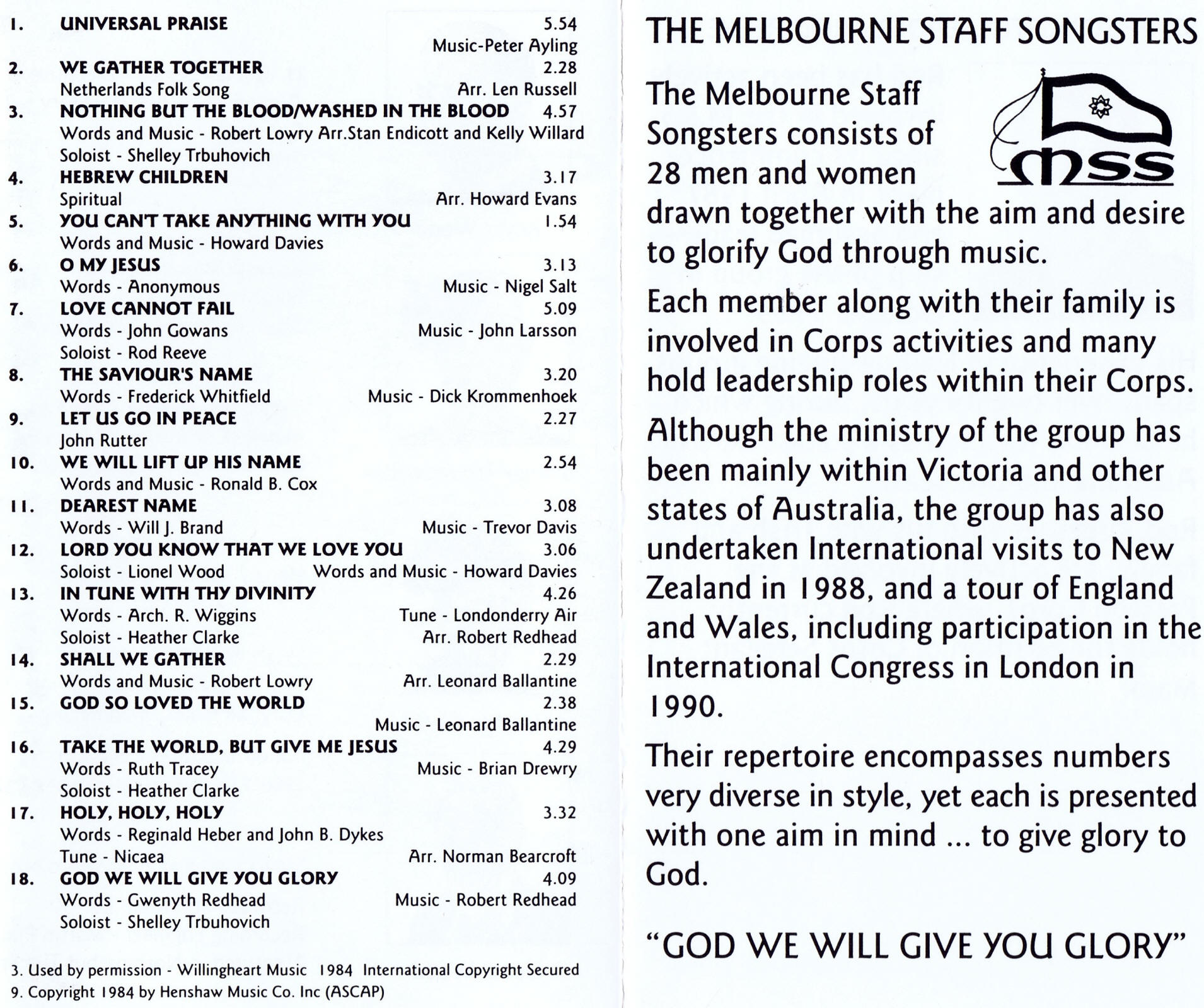 God We Will Give You Glory/td> Melbourne Staff Songsters - Soloist - Shelley Trbuhovich Rod Reeve Words; Gwenyth Redhead, Music; Robert Redhead