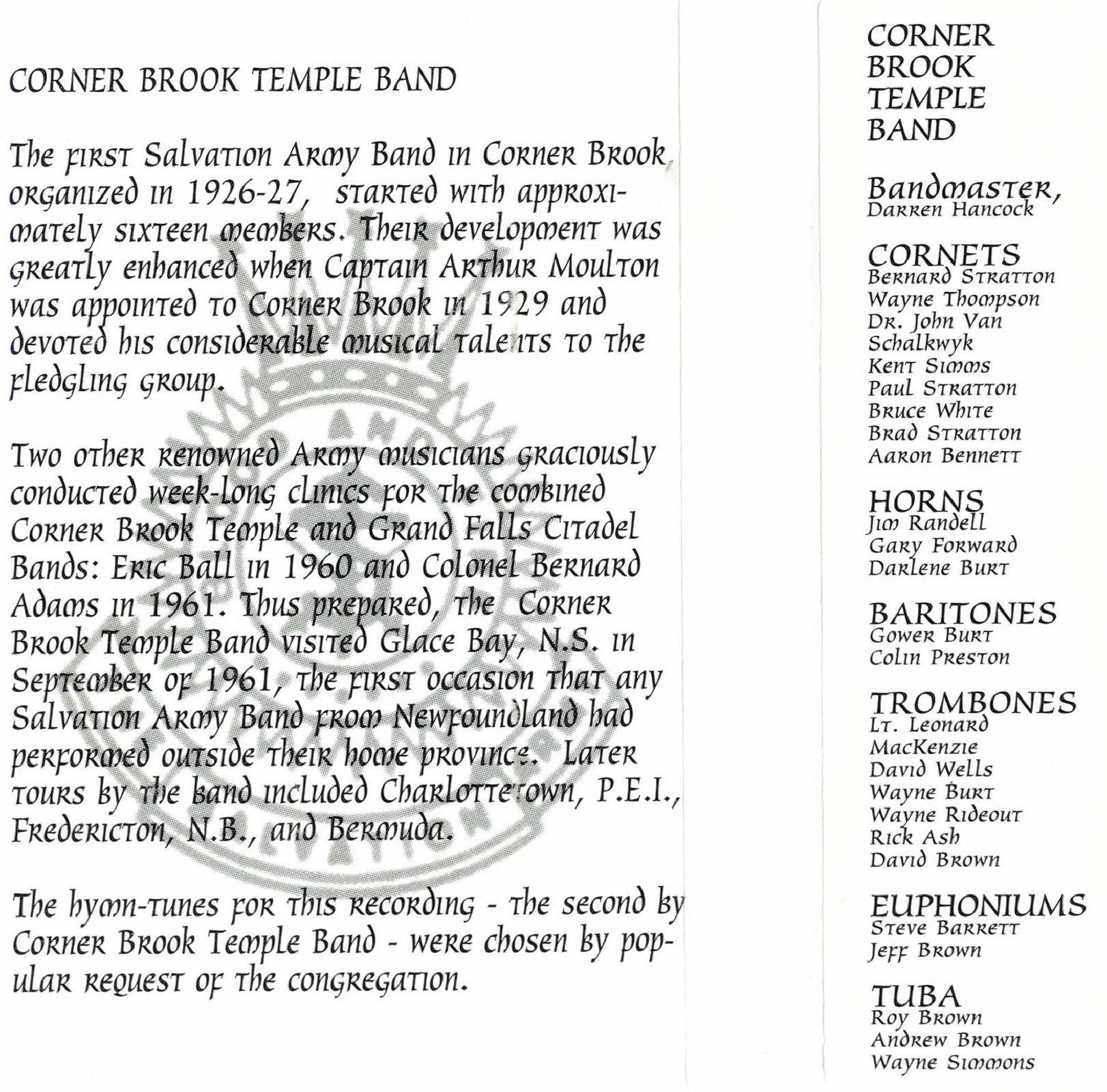 | Bullinger | Corner Brook Temple Band | Darren Hancock | |