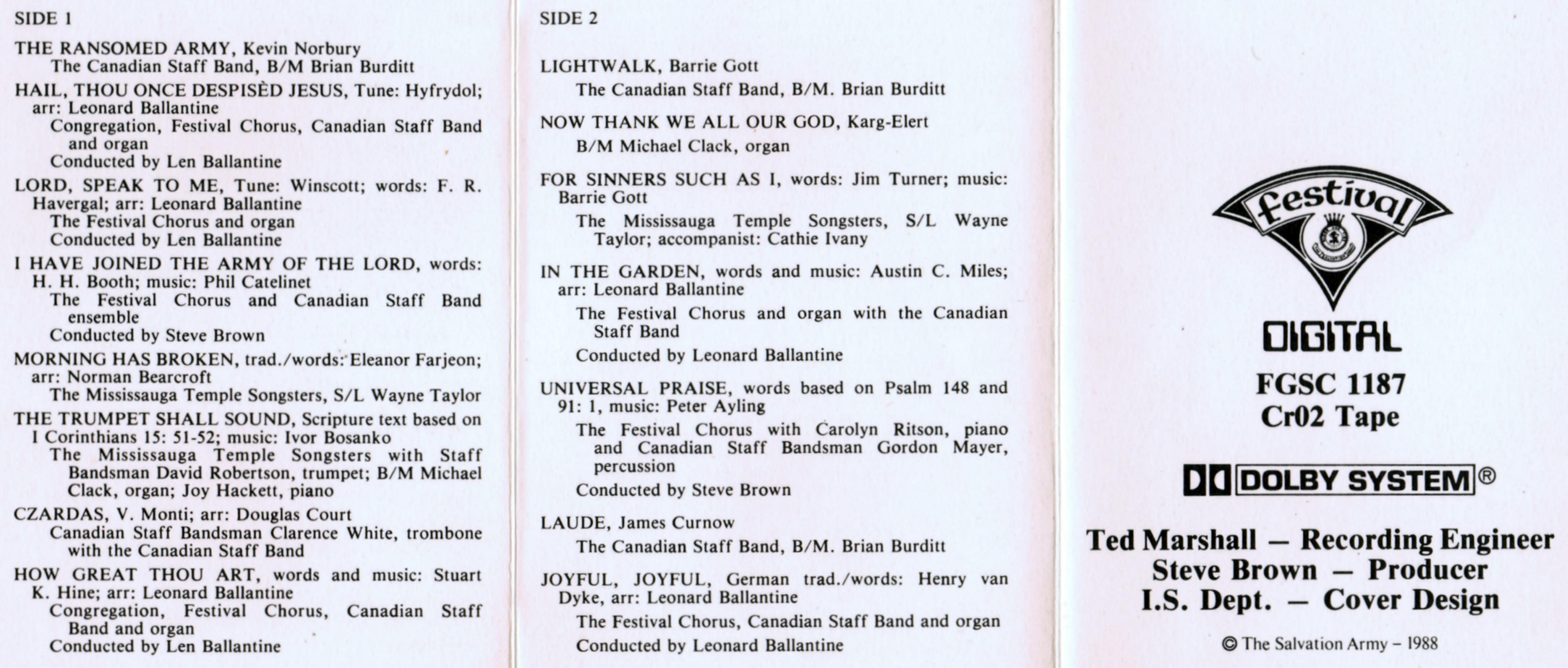 | I Have Joined the Army of the Lord | Festival Chorus & Canadian Staff Band | Steve Brown | Words; H.H. Booth Music; Phil Catelinet |
