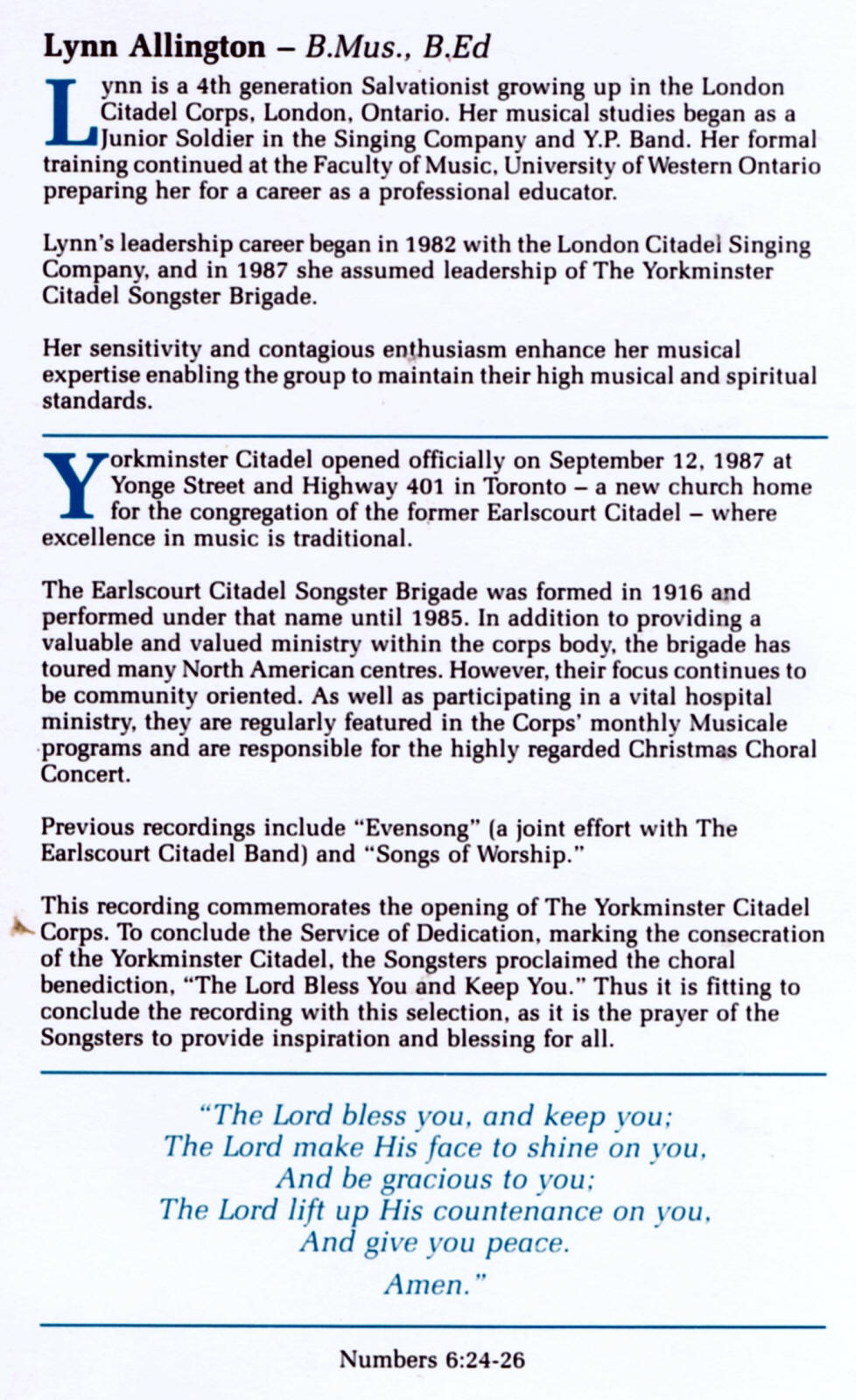| The Lord Bless You and Keep You | Yorkminster Citadel Songsters | Lyn Allington | Numbers 6:24 Music; John Rutter |
