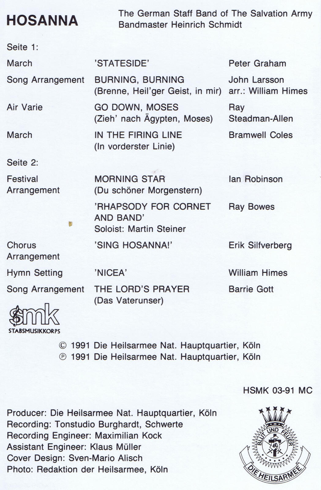 | Chorus Arrangement - Sing Hosanna | German Staff Band | Heinrich Schmidt | Erik Silfverberg |
