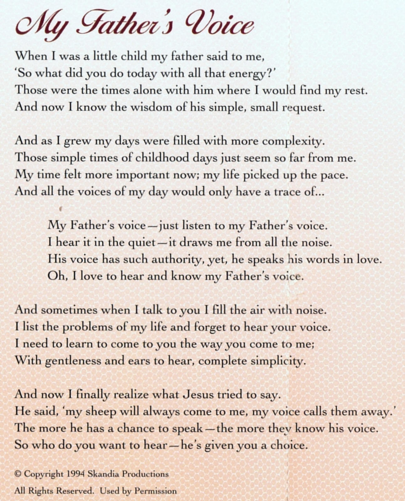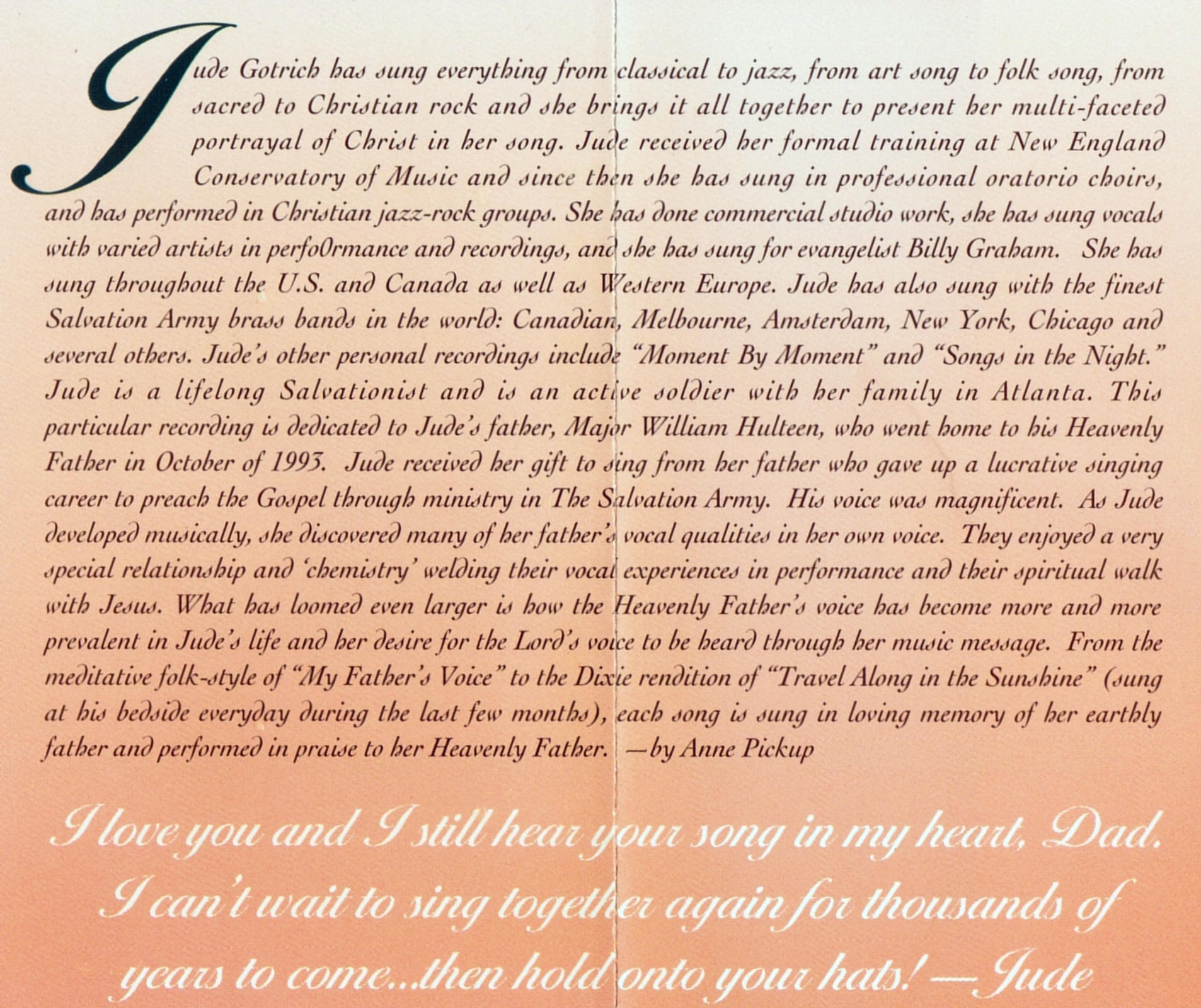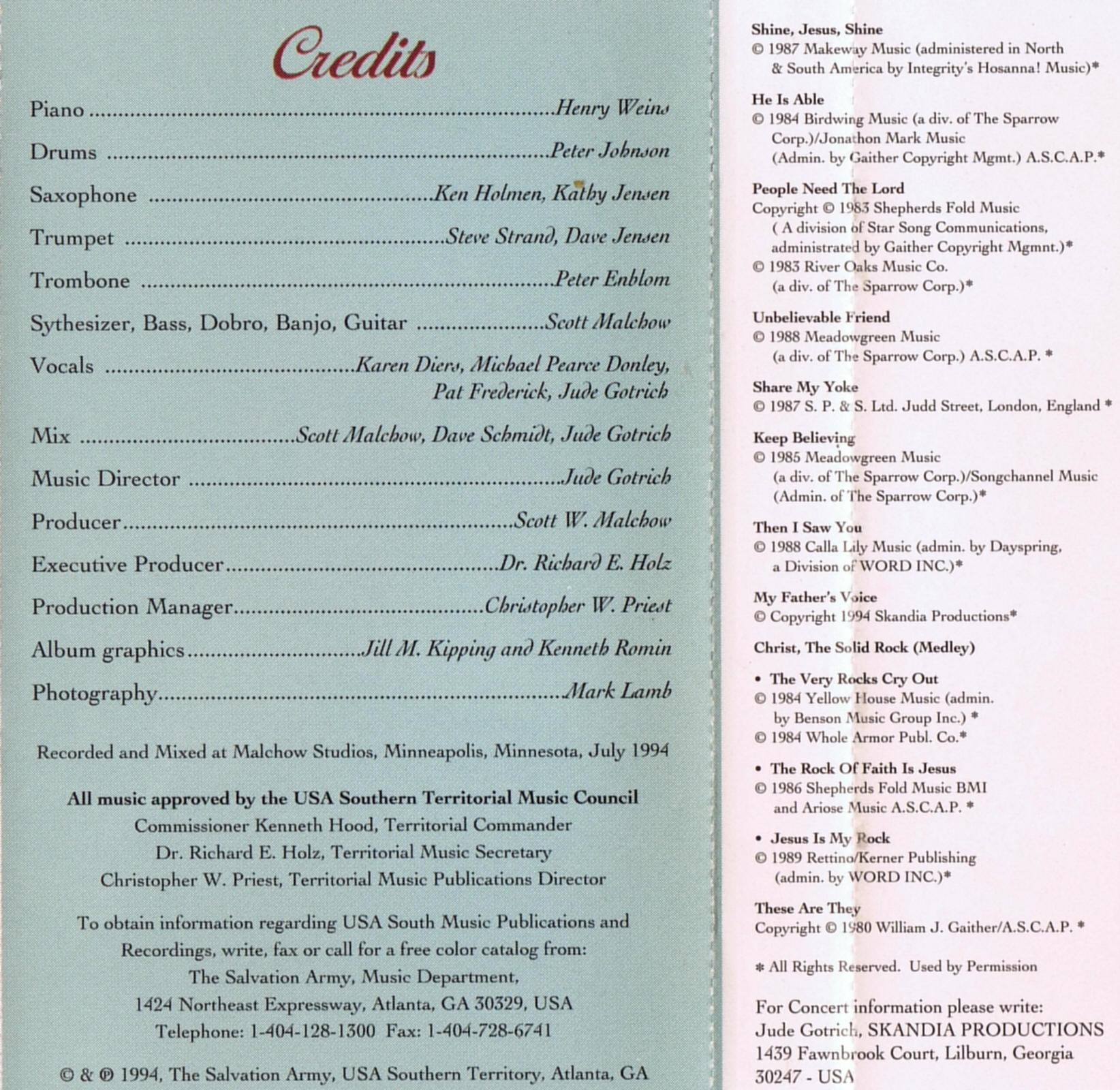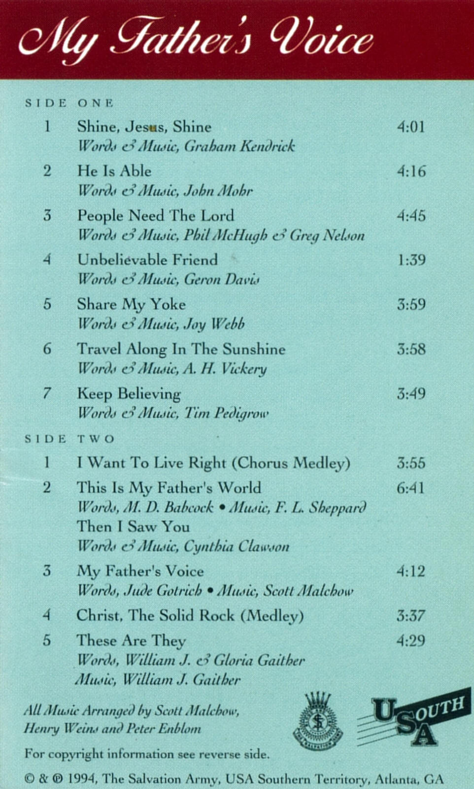 | My Father's Voice | Jude Gotrich | Words; Jude Gotrich Music; Scot Malchow |