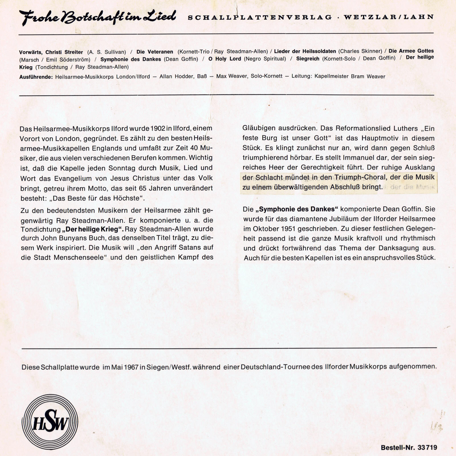 | Lieder der Heilsoldaten | Ilford Corps Band | Bram Weaver | Charles Skinner |