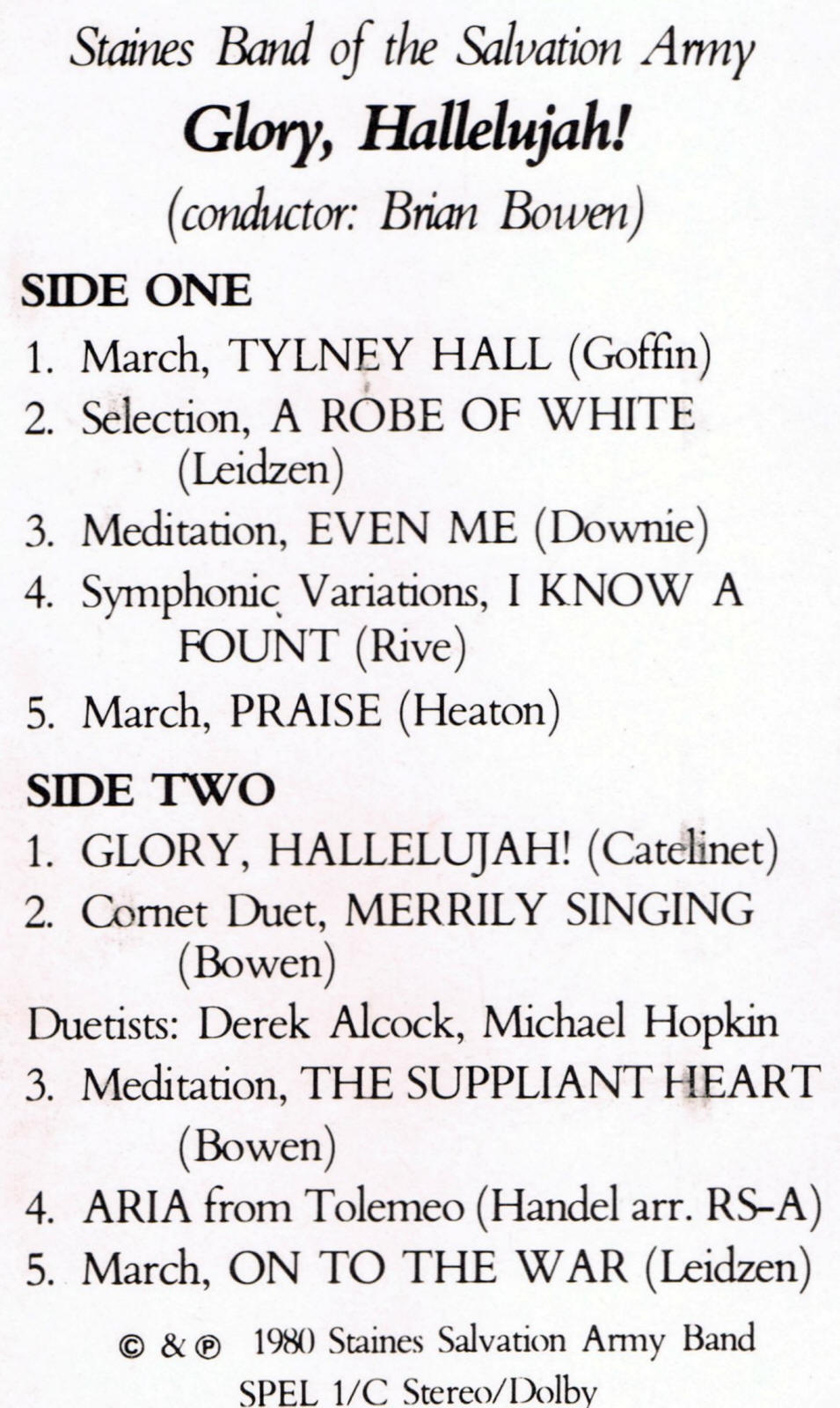 | Glory, Hallelujah | Staines Salvation Army Band | Brian Bowen | Catelinet |