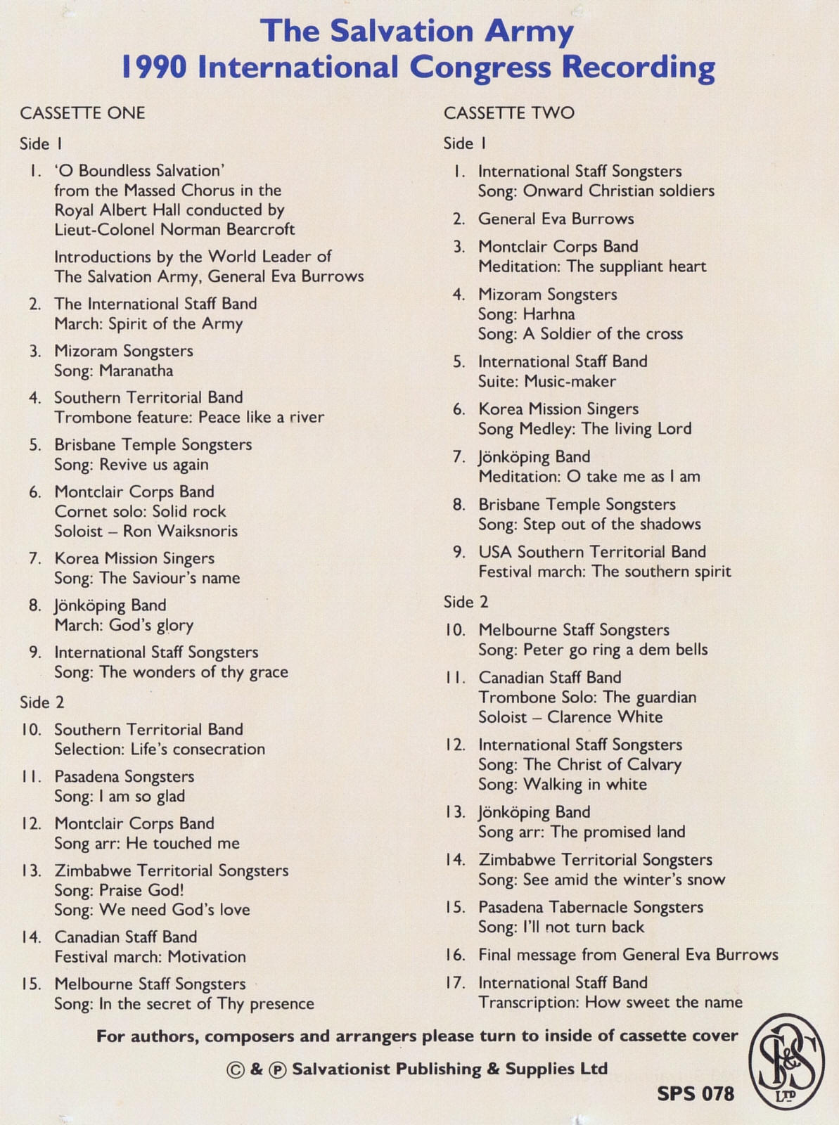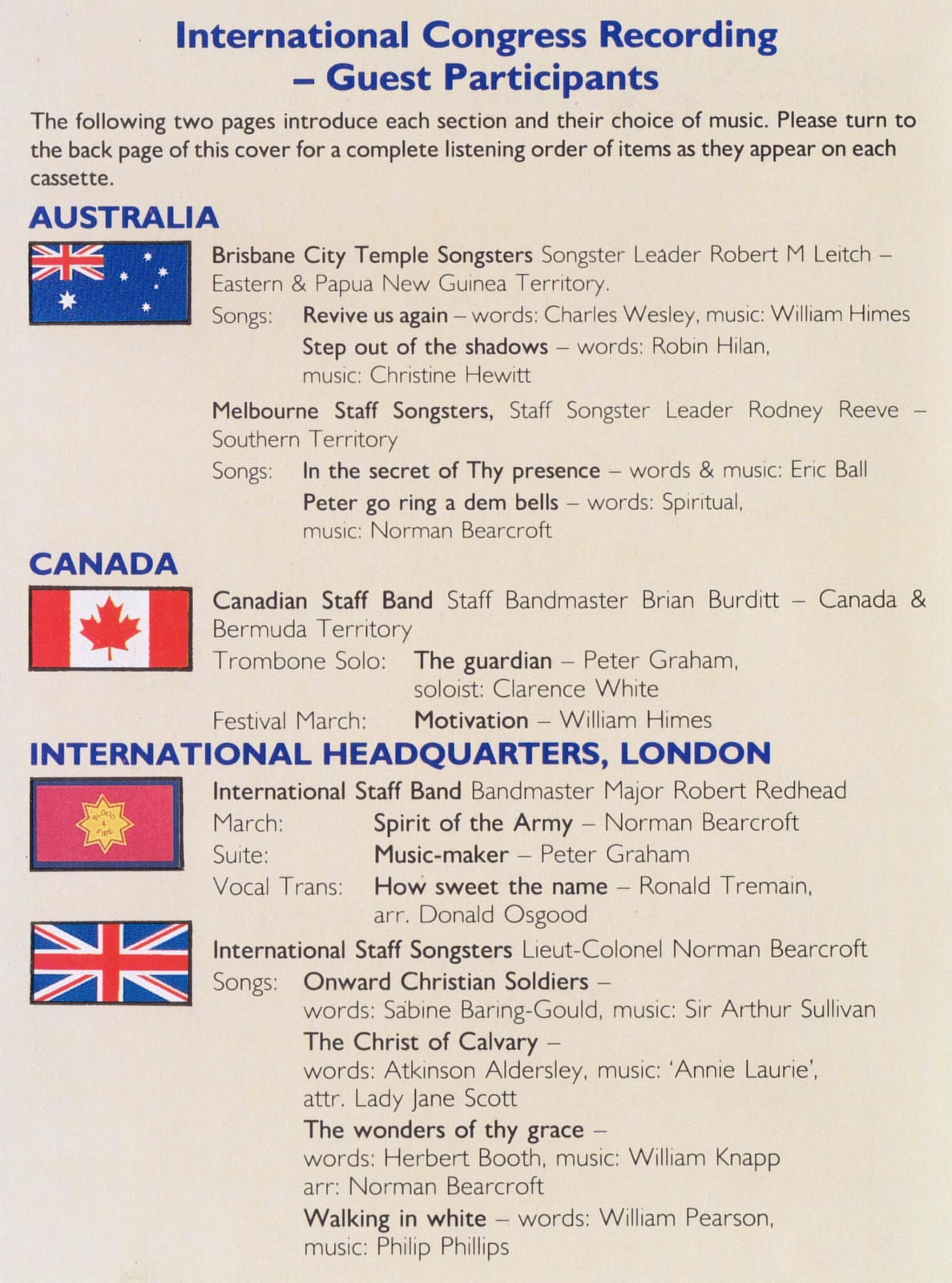 | Onward Christian Soldiers | International Staff Songsters | Lt. Col. Norman Bearcroft | Words; Sabine Baring-Gould Music; Sir Arthur Sullivan |
