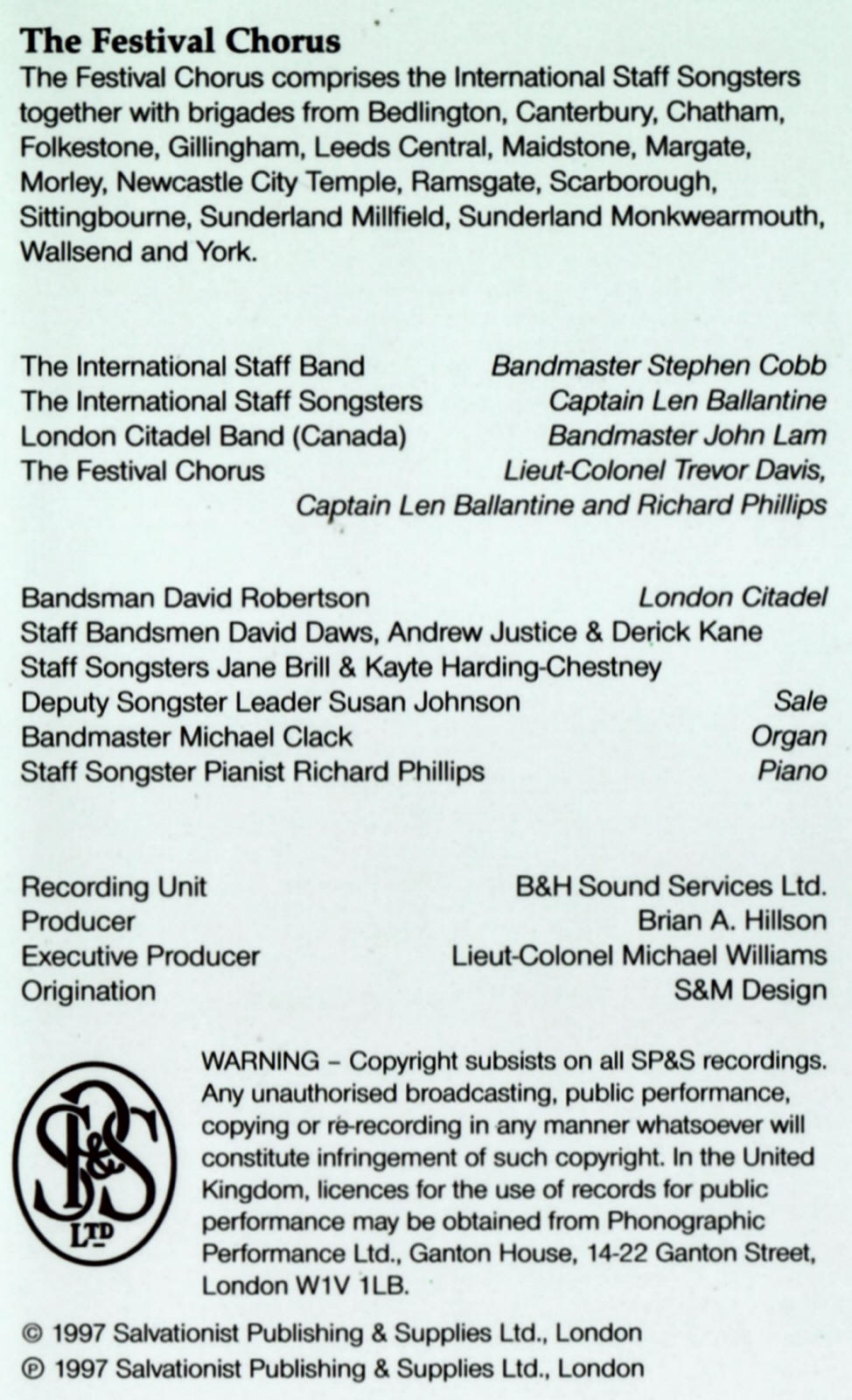 | Immortal, Invisible, God Only Wise | International Staff Band, Festival Chorus & Congregation | Trevor Davis, Len Ballantine, Richard Phillips | Walter Chalmers Smith, Welsh Hymn arr. Trevor Davis |